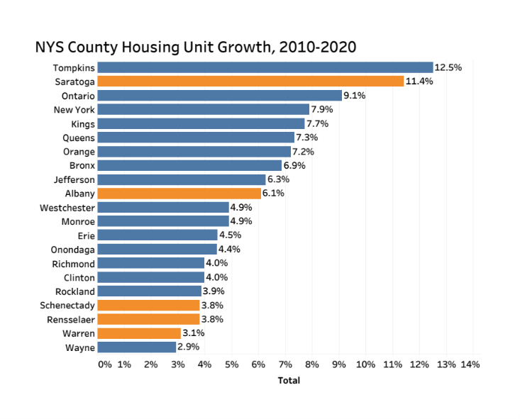 Between 2010 and 2020, the number of housing units in the Capital Region increased by 26,498 (5.2 percent) to 532,119. Only the New York City region had a faster growth rate of 7.3 percent. Saratoga County ranked second in the state for housing unit growth during that period, increasing by 11.4 percent and trailing only Tompkins County at 12.5 percent. Albany County ranked 10th at 6.1 percent.