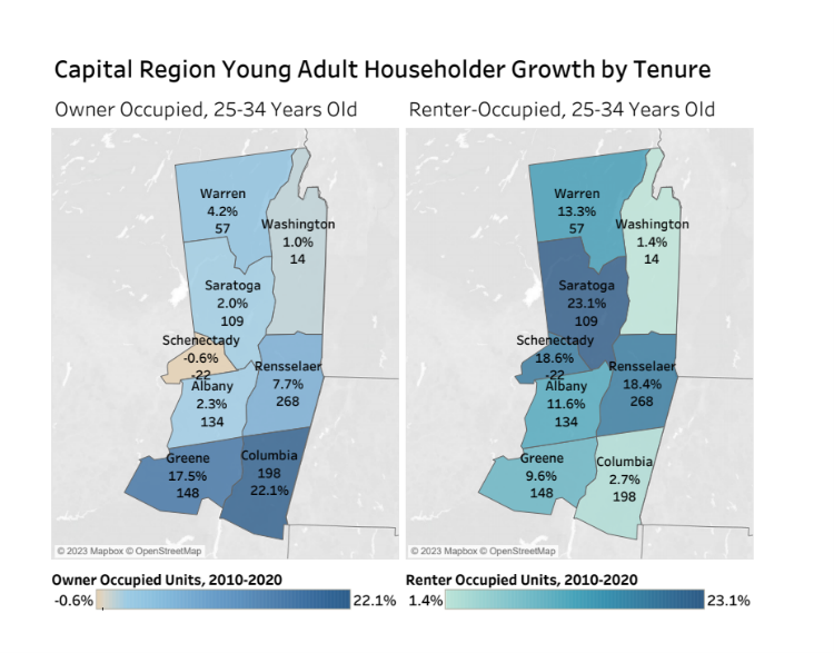Columbia and Greene counties ranked first and second in New York for fastest growth among owner-occupied units with young adult householders, increasing 22.1 percent and 17.5 percent, respectively. Among renter-occupied units with young adult householders, Saratoga County had the state’s fastest growth at 23.1 percent. Schenectady County ranked sixth at 18.6 percent and Rensselaer County ranked seventh at 18.4 percent.