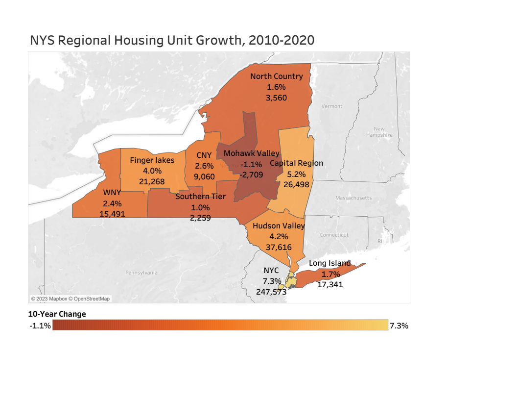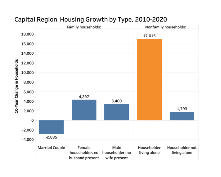 ALBANY, NEW YORK – As New York struggles with a shortage of homes for sale and for rent, new statistics from the 2020 Decennial Census show the Capital Region led upstate in growing its inventory of housing units over the past decade. And much of the region’s housing growth was driven by householders living alone, according to a Center for Economic Growth (CEG) analysis of the U.S. Census Bureau data.