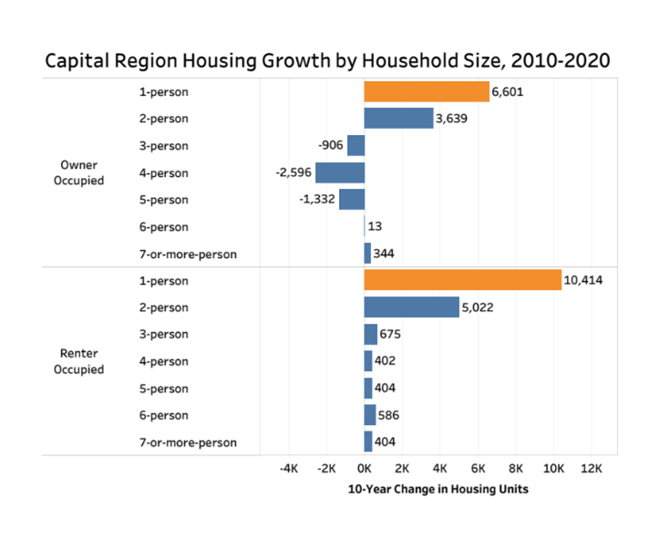 These housing type trends are also apparent in regional changes in household size. For example, the Capital Region’s number of owner-occupied units with one-person households increased by 10.3 percent over the 10-year period – the third fastest growth rate in the state. The number of renter-occupied units with one person increased by 15.4 percent – the state’s second fastest growth rate.