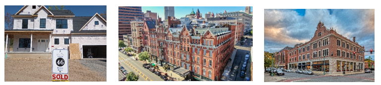 A single-family home under construction in Colonie (left), Redburn’s 93-unit Kenmore apartment building in Albany (center), and Rosenblum’s 101-unit The News Apartments in Troy.