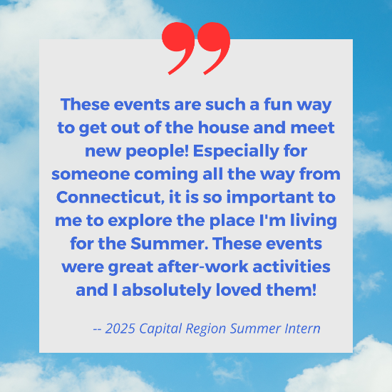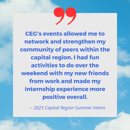 The 2025 Summer Internship Engagement Program ended on July 28. This cohort included 142 unique interns who attended the events, up 9 percent from the previous year. Those interns came from 20 Capital Region companies, compared to 13 in summer 2024. About 40 percent of the interns came from outside the Capital Region or outside the state or country. The 2025 CEG Summer Internship Engagement Program’s supporting sponsors were Goldman Sachs Ayco, Northeast Shared Services, Regeneron Pharmaceuticals, and Turner Construction. Monaco Cooper Lamme & Carr, PLLC was a contributing sponsor.