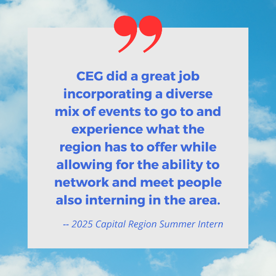 “The Capital Region has many extraordinary and beautiful college and university campuses, but many students don’t know the treasures that can be found off those premises. We launched the CEG Summer Internship Engagement Program to help students interning at local companies discover the rich places and people they otherwise may have never encountered. It’s like a treasure hunt: they find golden opportunities to meet new people while having fun and learning about the area, and our employers find talent more engaged in the Capital Region, said CEG President and CEO Mark Eagan.