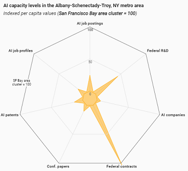 In fact, the Brookings Institution this month released a report on the cities that will drive the AI revolution. Brookings identified the Albany-Schenectady-Troy metropolitan statistical area as one of 87 potential adoption centers with “some, but below-average, AI activities.” Only 13 metros were classified as “early adopters” and 21 as “research and contracting centers.” There are 261 metros with no significant AI activities. The Albany metro area scored best on Brookings’ Indexed AI capacity levels in the areas of federal contract and federal R&D.