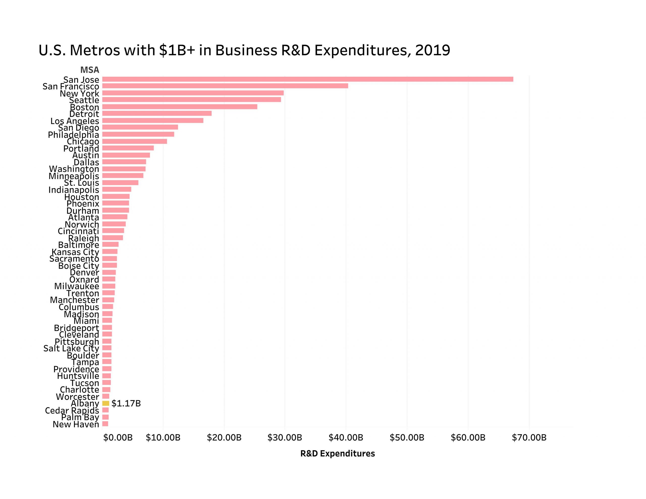 The metro with the most business R&D expenditures was the San Jose-Sunnyvale-Santa Clara MSA at $67.4 billion. The Albany-Schenectady-Troy MSA ranked 48th among the 51 $1 billion-plus business R&D metros. However, it ranked 30th for R&D spending per capita ($1,325) and 31st for R&D intensity, which is the ratio of R&D expenditures to gross regional product (1.9 percent).