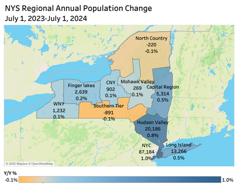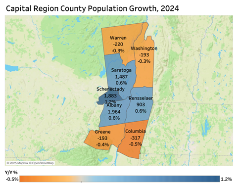 The Capital Region was New York’s third fastest-growing region for population in 2024, according to a Census for Economic Growth analysis of U.S. Census Bureau statistics.
