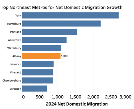 The Albany-Schenectady-Troy MSA’s net domestic migration was 1,080 in 2024, meaning more people from within the country moved into the metro area than those moving out of it to elsewhere in the U.S. It was the only MSA in the state to experience annual net domestic migration growth. Out of 49 Northeast metros, the Albany-Schenectady-Troy MSA ranked sixth for net domestic migration.