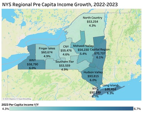 The Capital Region had upstate New York’s fastest-growing per capita income in 2023, boosted by gains in Albany, Saratoga, Greene and Schenectady counties, according to a Center for Economic Growth (CEG) analysis of new data from the U.S. Bureau of Economic Analysis.