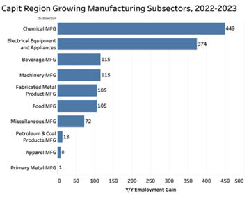 In the Capital Region, annual job gains exceeded 100 in five manufacturing subsectors: chemical manufacturing (+449), electrical equipment and appliances and electronics (+374), beverage manufacturing (+115), machinery manufacturing (115), food manufacturing (+105), and fabricated metal product manufacturing (+105).
