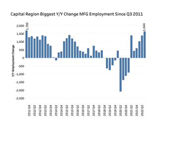 Between the third quarters of 2021 and 2022, Capital Region manufacturers added 1,644 jobs, or 4.9 percent. That was the greatest year-over-year increase and the fastest growth rate since Q3 2011.