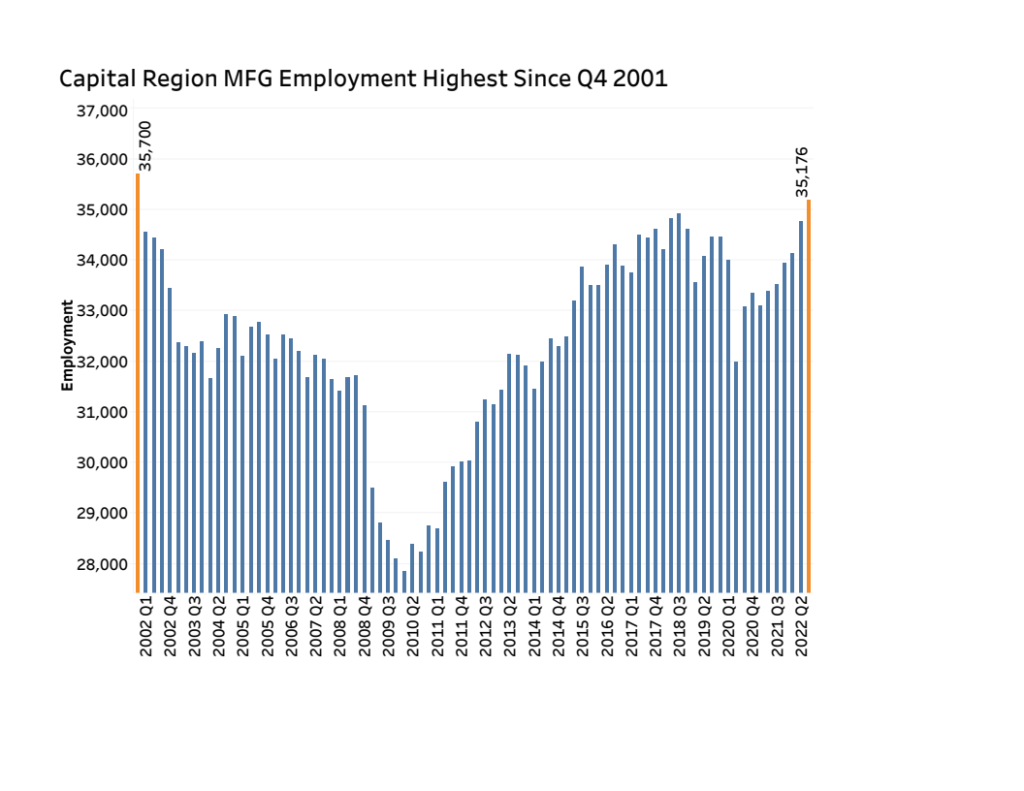 In the third quarter of 2022, Capital Region privately owned manufacturers averaged 35,176 jobs – the sector’s highest quarterly employment since Q4 2001. That also makes the Capital Region’s manufacturing sector the only one in the state among nine other economic development regions that is larger than it was before the pandemic, three years earlier.