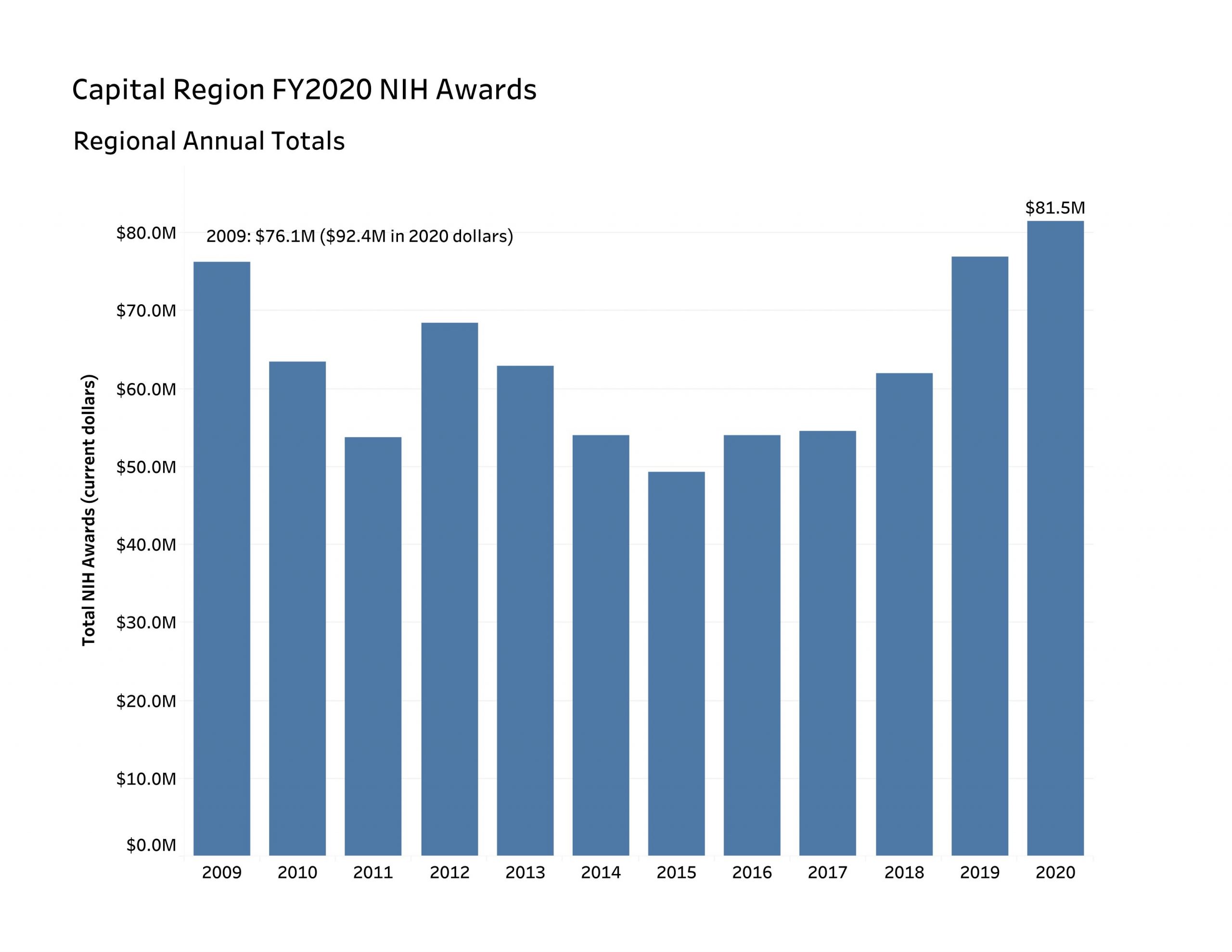ALBANY, NEW YORK – In fiscal 2020, the Capital Region’s Life Sciences Cluster received its greatest amount of National Institutes of Health (NIH) awards in 12 years, when adjusting for inflation. The federal funding is supporting a spectrum of research ranging from a plague vaccine, a coronavirus anti-viral, the profiling of dysfunctional COVID-19 lungs, and a neuro-exergame for Alzheimer’s disease patients, according to a Center for Economic Growth (CEG) analysis of new data from NIH’s Research Portfolio Online Reporting Tools (RePORT).