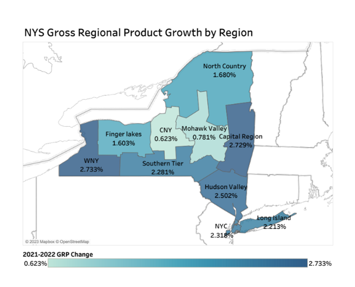 In 2022, the eight-county region’s GRP (in current dollars) totaled $93,582,808. In chained 2012 dollars, which take inflation into account, the region’s GRP grew at an annual rate of 2.729 percent. That was just behind Western New York’s rate of 2.733 – the fastest in the state.