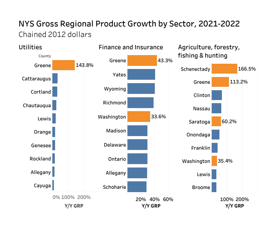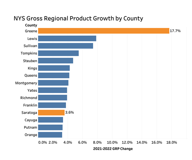 In 2022, Greene County’s GRP was $2,784,197 in current dollars. In chained 2012 dollars, that represented a 17.7 percent increase from the previous year – the fastest growth rate in the state. At 3.7 percent, Saratoga County was the Capital Region’s second fastest-growing county for GDP and the 12th fastest in the state.