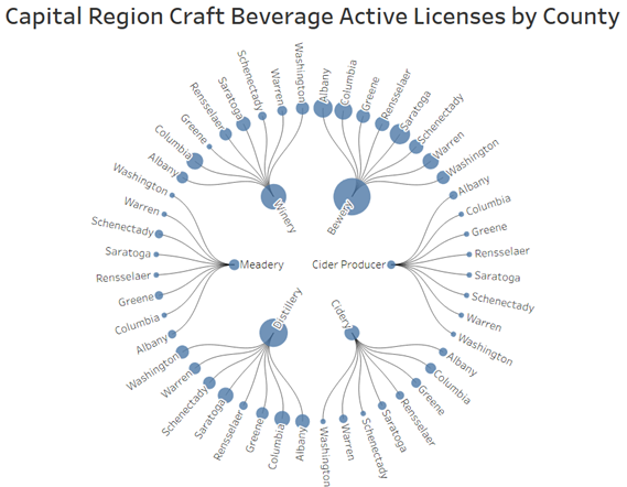 CEG’s biennial survey of the Capital Region’s craft beverage manufacturing industry found there were 201 active licenses issued by the State Liquor Authority for the production of beer, spirits, wine, cider and mead, not including temporary manufacturing and combined licenses. With some producers holding several types of licenses, there were 140 unique locations in the eight-county region, as of late July.