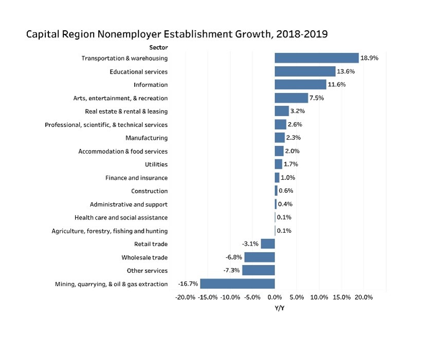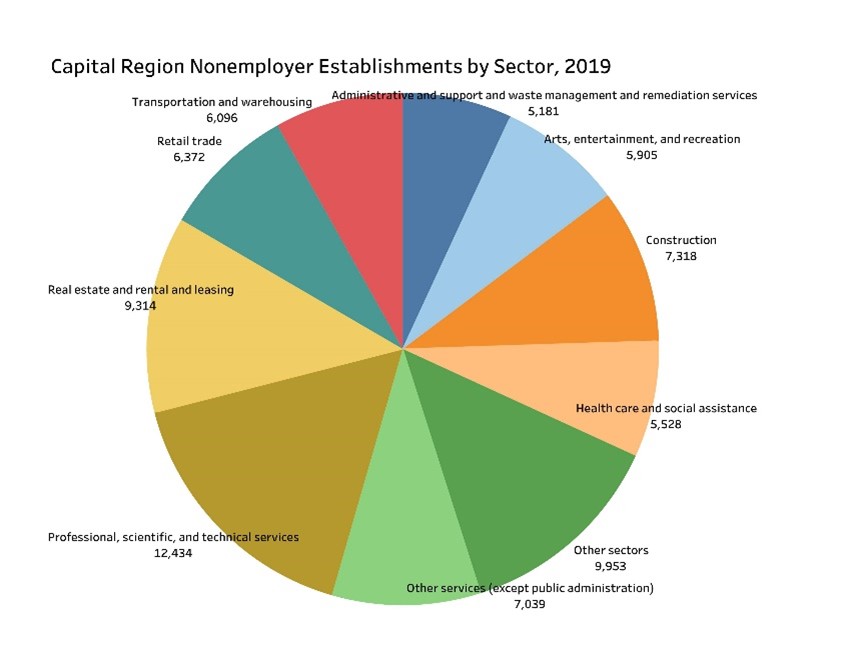 In 2019, the eight-county Capital Region had 75,148 nonemployer establishments, which are businesses with at least $1,000 in receipts, with no paid employees or payroll, and are subject to federal income tax. These businesses include independent contractors and freelancers, among others. Those nonemployer establishment had a total $3.46 billion in receipts, up 3.2 percent from the prior year.