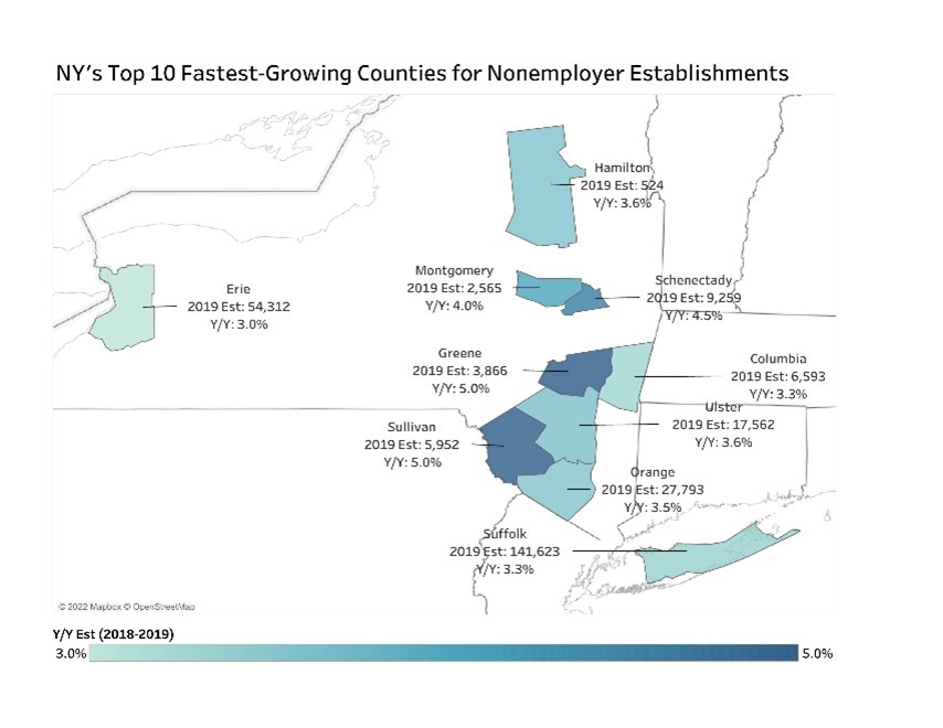 Prior to the pandemic, the Capital Region’s gig economy was expanding. In fact, Greene, Schenectady and Columbia counties were among New York’s fastest-growing counties for nonemployer establishments, according to a Center for Economic Growth (CEG) analysis of new U.S. Census Bureau data.