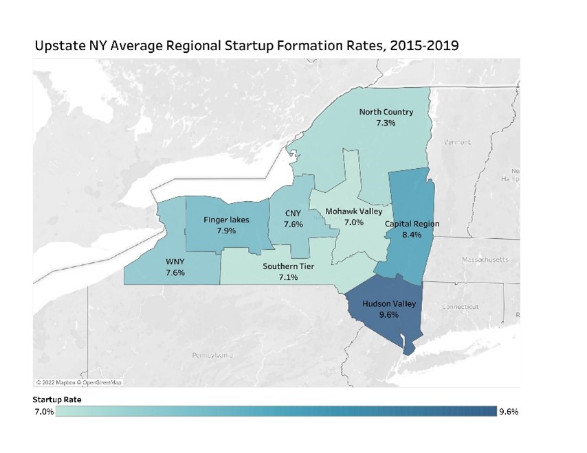 1 The startup formation rate is calculated by dividing employer establishment births by the total number of employer establishments. Upstate includes all New York State Regional Economic Development Council regions except the New York City and Long Island Regions.