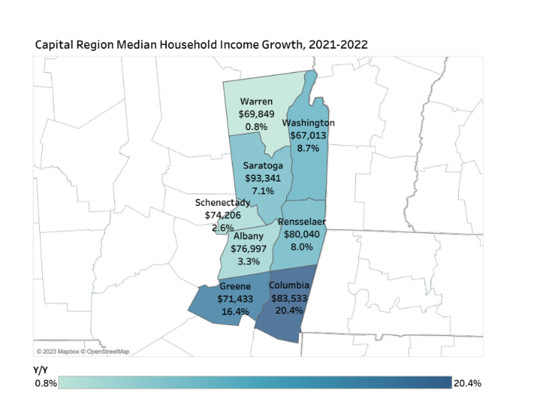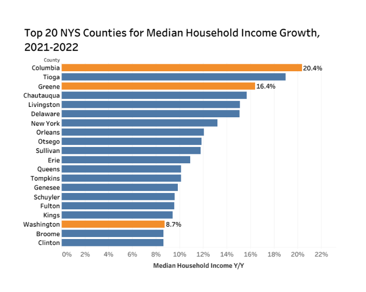Columbia and Greene Counties had New York’s first and third fastest-growing median household incomes in 2022, according to a Center for Economic Growth (CEG) analysis of new data from the U.S. Census Bureau’s Small Area Income and Poverty Estimates (SAIPE) program.