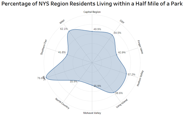 For the first time, last March, the annual CHR&R statistics featured a metric for “access to parks,” which uses ArcGIS Online and U.S. Census TIGER/Line Shapefile data to measure the percentage of the population living within a half mile of a park. In the eight-county Capital Region, 49.9 percent (552,730) of residents live within half a mile of a park.1