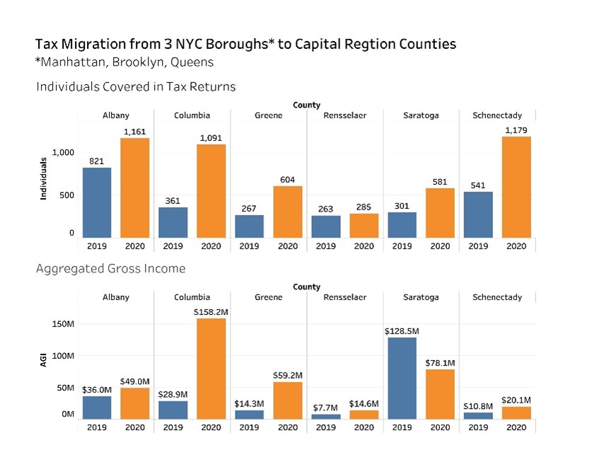 The number of taxpayers annually moving to the Capital Region from New York City’s three largest boroughs nearly tripled during the first year of the pandemic in 2020, and the amount of adjusted gross income (AGI) they brought with them almost doubled, according to a center for Economic Growth analysis of new IRS data.
