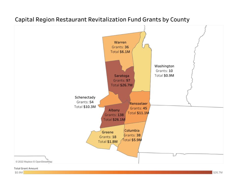 Capital Region food service and drinking places last year received more than $89 million from the Restaurant Revitalization Fund (RRF) to help them continue operating during the pandemic. Almost half of the awardees used some of that funding for outdoor seating accommodations, and Saratoga County saw the largest influx of relief aid, according to a Center for Economic Growth (CEG) analysis of new data from Empire State Development.