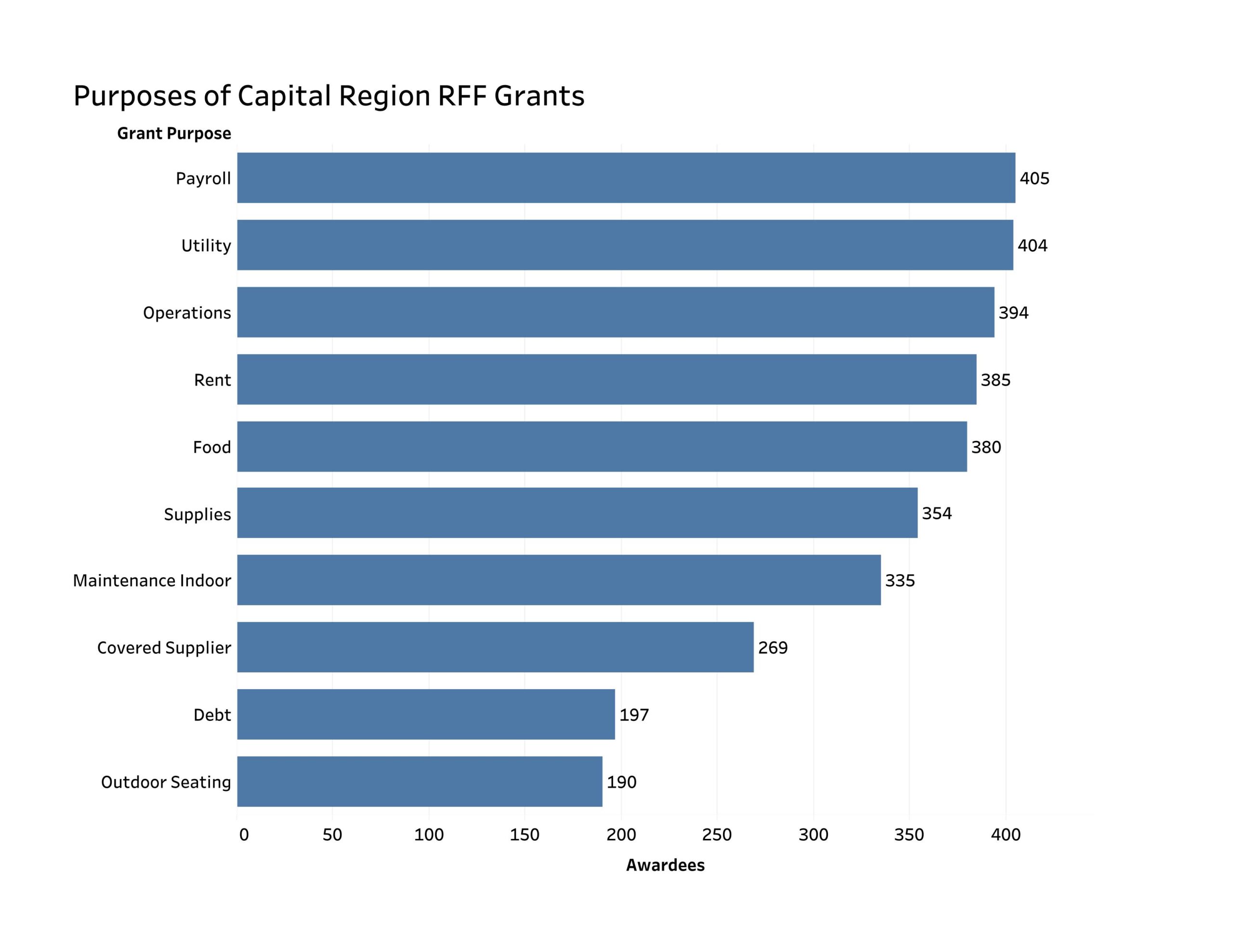 The minimum RRF grant was $1,000 and the maximum was $5 million per establishment. In the Capital Region the smallest grant was $2,079 and the largest was $2.5 million. Regionwide, the average grant was $204,181 and the median was $115,504.