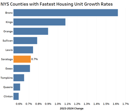 Saratoga County was New York’s sixth fastest-growing county for housing units in 2024, according to a Center for Economic Growth analysis of U.S. Census Bureau estimates.