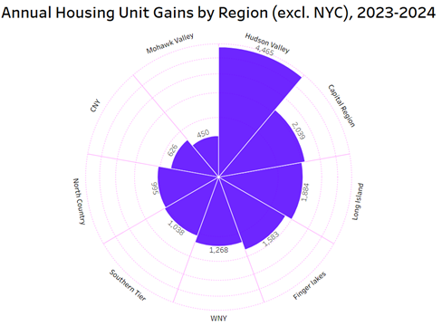 Between July 1, 2023 and July 1, 2024, the eight-county Capital Region’s inventory of housing units increased by 2,039 (0.4 percent) to 542,470. That was the third largest annual increase in housing units among New York’s 10 economic development regions, trailing the Hudson Valley (4,465) and New York City (31,504).