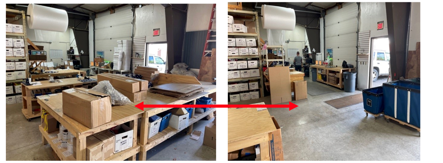 Before and after pictures showing optimized floor utilization at Gettysburg Flag Work’s East Greenbush facility.
