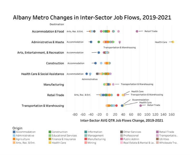 In 2021, several sectors in the Albany-Schenectady-Troy metropolitan statical area each quarter attracted far fewer workers who previously worked in accommodation and food services, when compared to the pre-pandemic period of 2019. For example, each quarter, the healthcare and social assistance sector averaged 51 fewer job flows from the accommodation and food services sector, followed by administrative and waste services (-40) and construction (-29). These are inter-sector job flows from anywhere in the country to the Albany metro area.