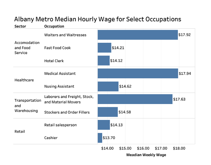 These changes in job flow dynamics come as certain sectors are rapidly growing in the region, especially Transportation and Warehousing. That growth also adds to wage competition between sectors. For example, in the Capital Region, a nursing assistant’s median hourly wage entry wage ($14.62) is only 41 cents more than that of a fast wood worker and 4 cents more than stockers and order fillers, according to occupational data from the New York State Department of Labor.