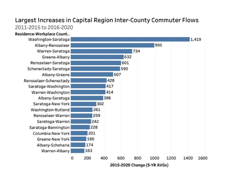 The commuter flows with the largest average declines in the region between the 2011-2015 and 2016-2020 periods were Saratoga-Albany (-2,182), Saratoga-Schenectady (-1,338), Schenectady-Albany (-1,268) and Warren-Washington (-840).