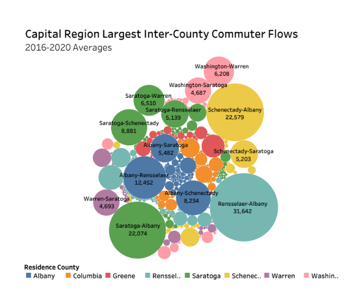 The region’s largest inter-county commuting flow was Rensselaer-Albany (31,642), followed by Schenectady-Albany (22,579) and Saratoga-Albany (22,074).