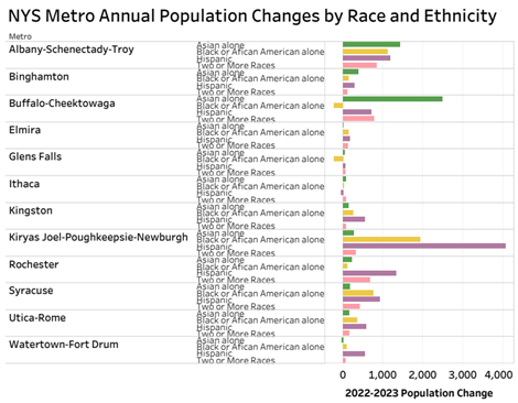 Between July 1, 2022 and July 1, 2023, the five-county Albany metro area’s population increased by 1,087 to 904,682. Among the state’s 13 metro areas, Albany had the second largest annual gains of black or African American alone (+1,129) and multi-racial (+833) residents. It also ranked third for its increase of Asian alone residents (+1,431) and fourth for Hispanic residents (+1,193). The region also had the state’s third smallest annual loss of white alone residents (-4,033).