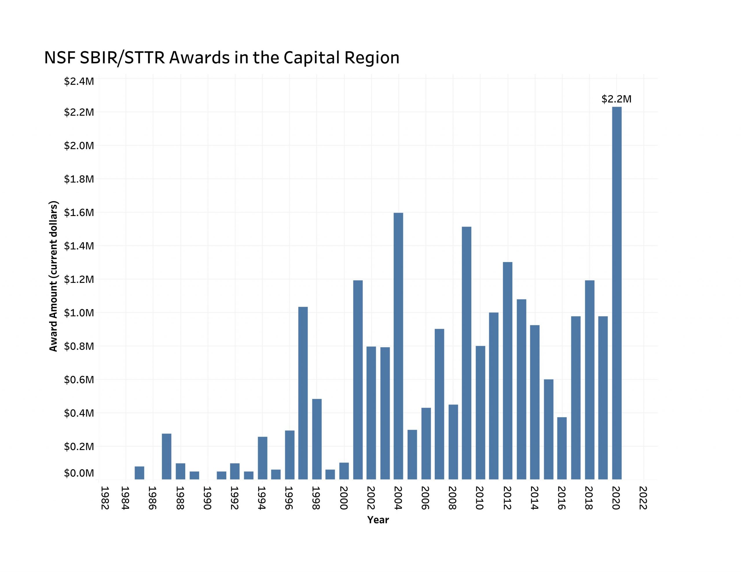In fiscal 2020, the National Science Foundation (NSF) awarded $2.23 million in seed funding to four Capital Region startups through the Small Business Innovation Research (SBIR) and Small Business Technology Transfer (STTR) programs. That was more than double the amount of SBIR and STTR funds the NSF awarded in the region’s eight counties the previous year and the most on record1. The previous high was set in 2004, when the award total was $1.6 million in current dollars, or $2.19 million in 2020 dollars.