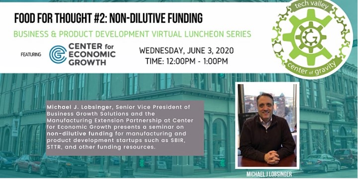 The Manufacturing Incubator at Tech Valley Center of Gravity presents Food for Thought: A Business & Product Development Virtual Luncheon Series. Michael J. Lobsinger, Senior Vice President of Business Growth Solutions and the Manufacturing Extension Partnership at Center for Economic Growth will present a seminar and discussion on non-dilutive funding for manufacturing and product development startups such as SBIR, STTR, and other funding resources.