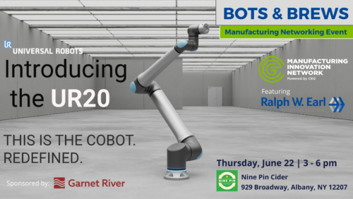 Join the Manufacturing Innovation Network, featuring Ralph W. Earl, for Bots & Brews on Thursday, June 22 from 3 – 6 pm at Nine Pin Cider in Albany, NY. Come see how cobots are putting the power of automation in manufacturers’ hands. You’ll get to experience the UR20 cutting-edge features